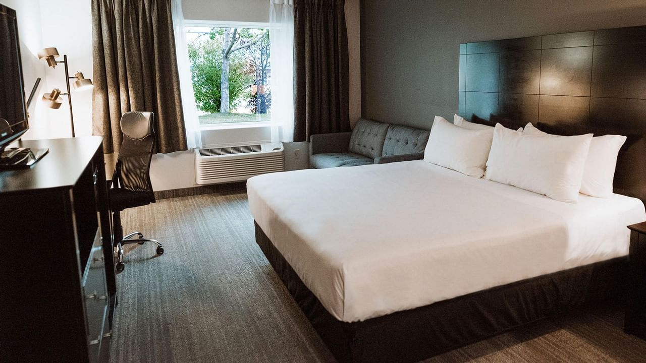 Bring your furry friend! This Coast King room is pet friendly and features a triple-sheeted king bed, a mini fridge, work desk.