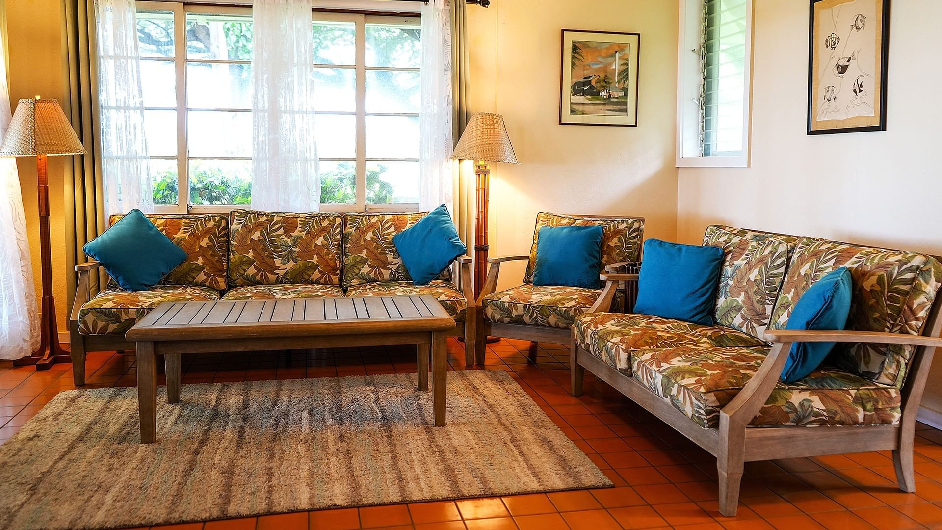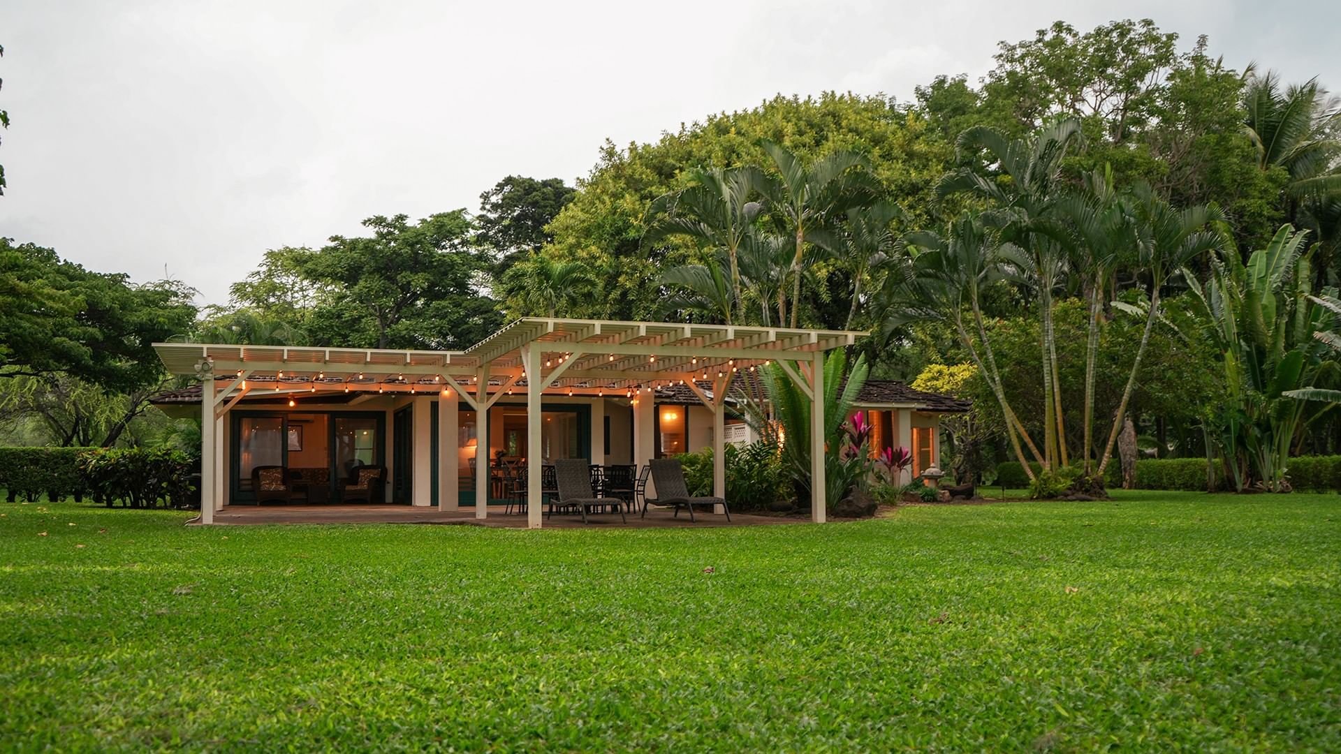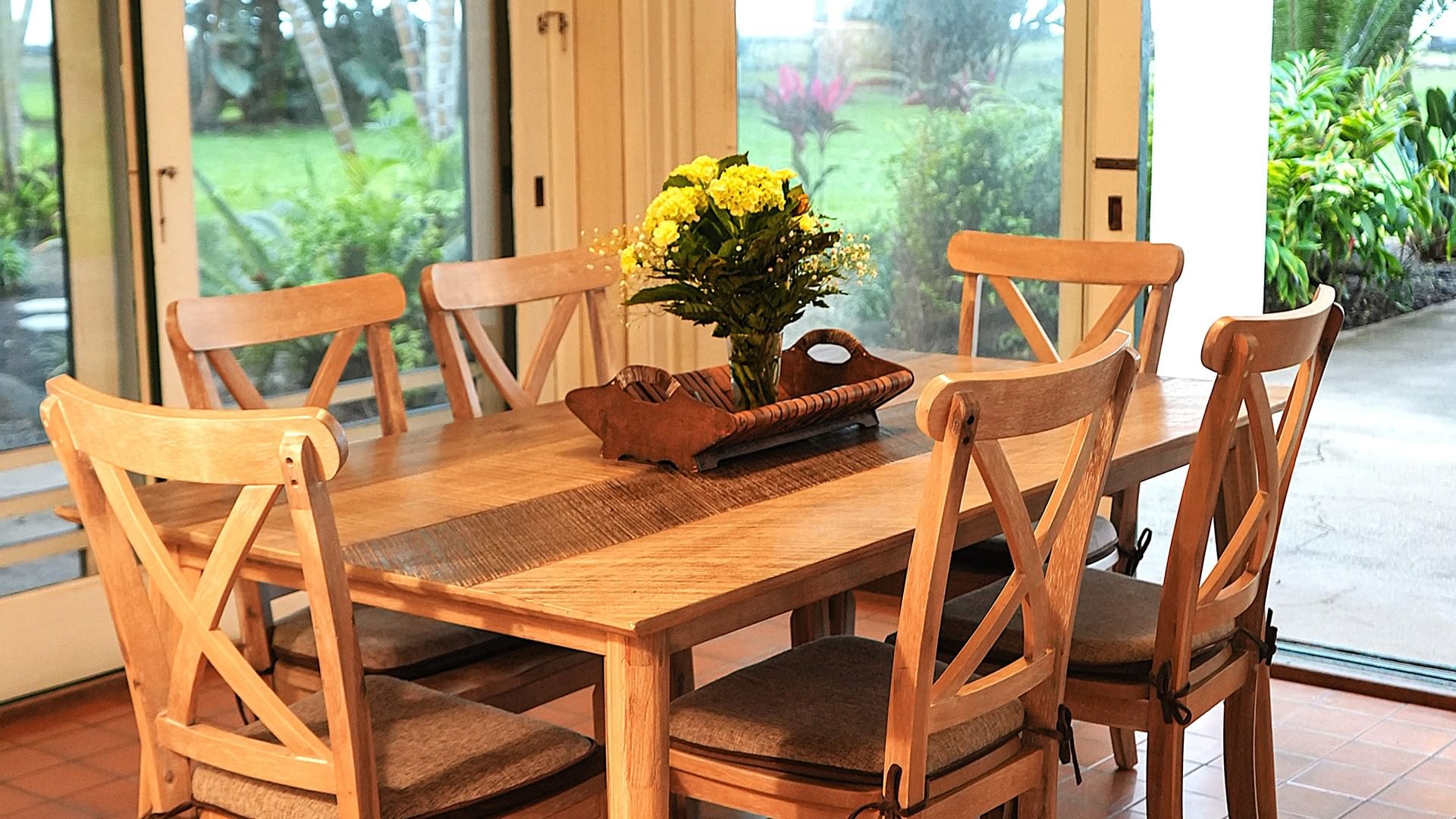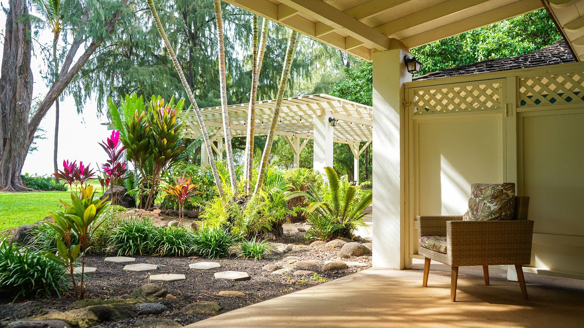 Bev Johnston’s Hale is tucked away on the far west edge of the property by itself. Surrounded by beautiful trees and garden areas, this lovely home has 3 bedrooms, 2 baths, and sleeps up to 6 guests. There is a dining area off the kitchen, a formal dining room, a large outdoor lanai with a dining table and chaises, and a comfortable large living room. The main bedroom has a private, nook lanai and a large, tiled shower area with an ocean view. A stay in this cottage gives you the sense that you are in your own private beachfront home.